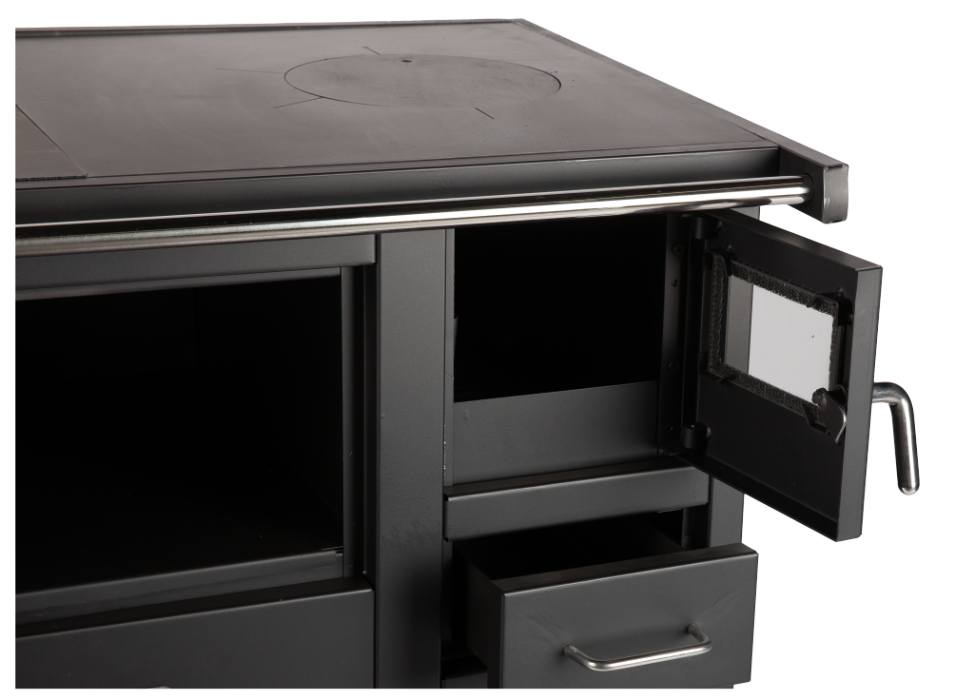 It is a solid-fuel stove that can be used both for heating dwellings and for cooking (it is equipped with a hob and an oven). The stove is made of steel with a steel hob and an oven (on the left or right).