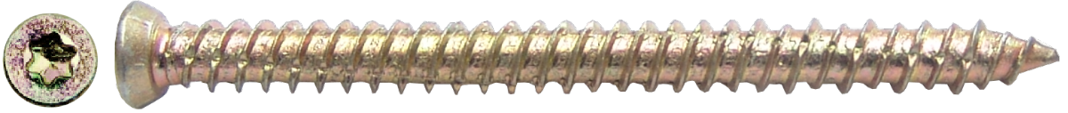 Yellow zinc-plated steel screw, used for installing doors and windows.