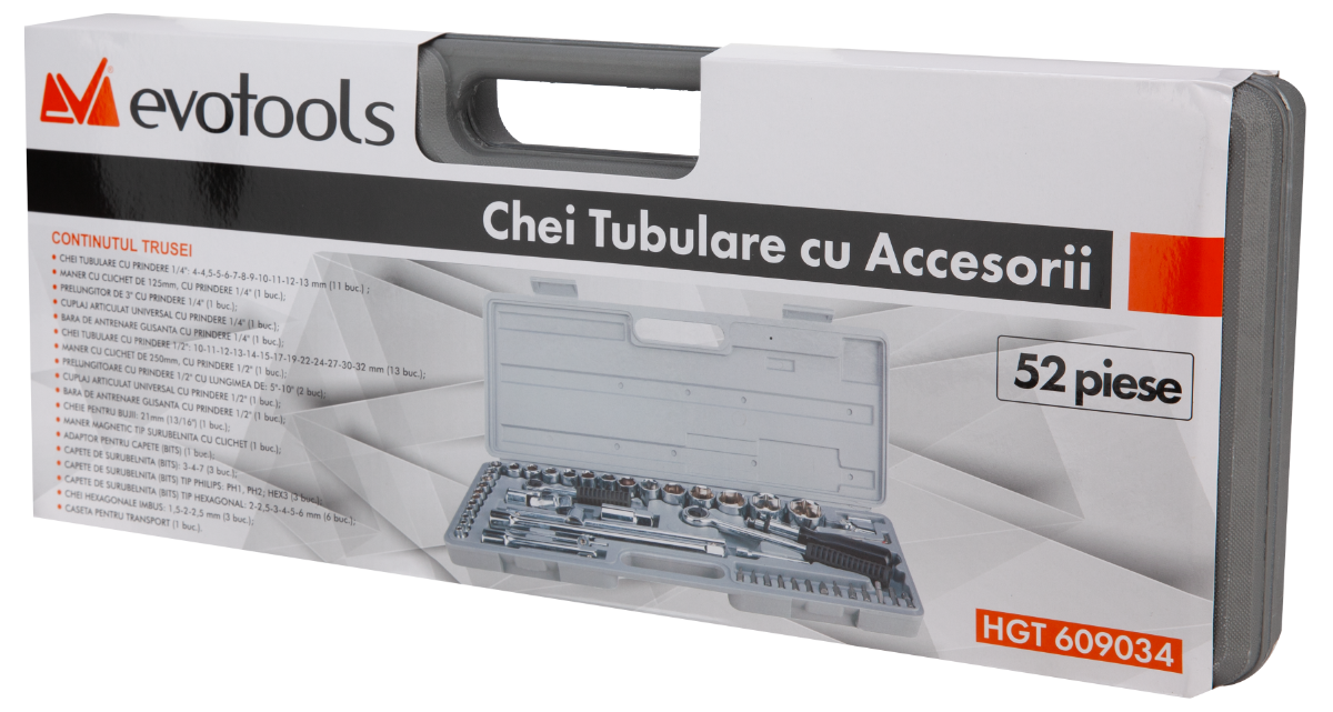 Socket set with accessories by EvoTools® consists of 52 pieces, made of carbon steel with a nickel-plated surface. They are organized in a metal case with a plastic insert.