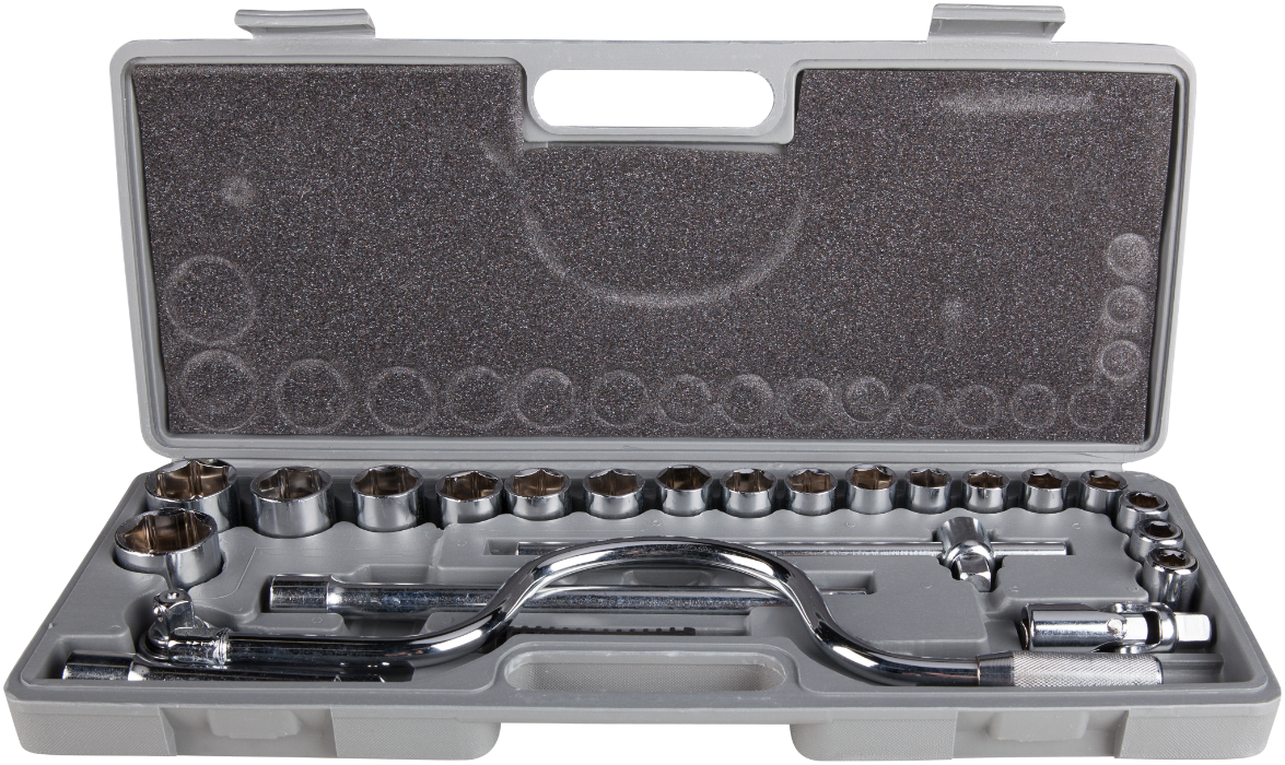 Socket set with accessories by EvoTools® consists of 24 pieces, made of carbon steel, with 1/2“ drive, organized in a plastic case.