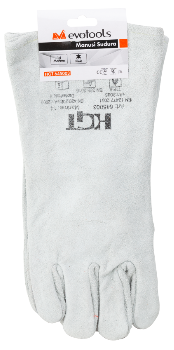 The main part of the glove is made of natural split leather with a minimum thickness of 1 mm, ensuring high resistance to abrasion, tearing and puncture. The gloves have five fingers and a cuff and are fully cotton lined for comfort and additional protection against heat. The colour of the gloves is grey.